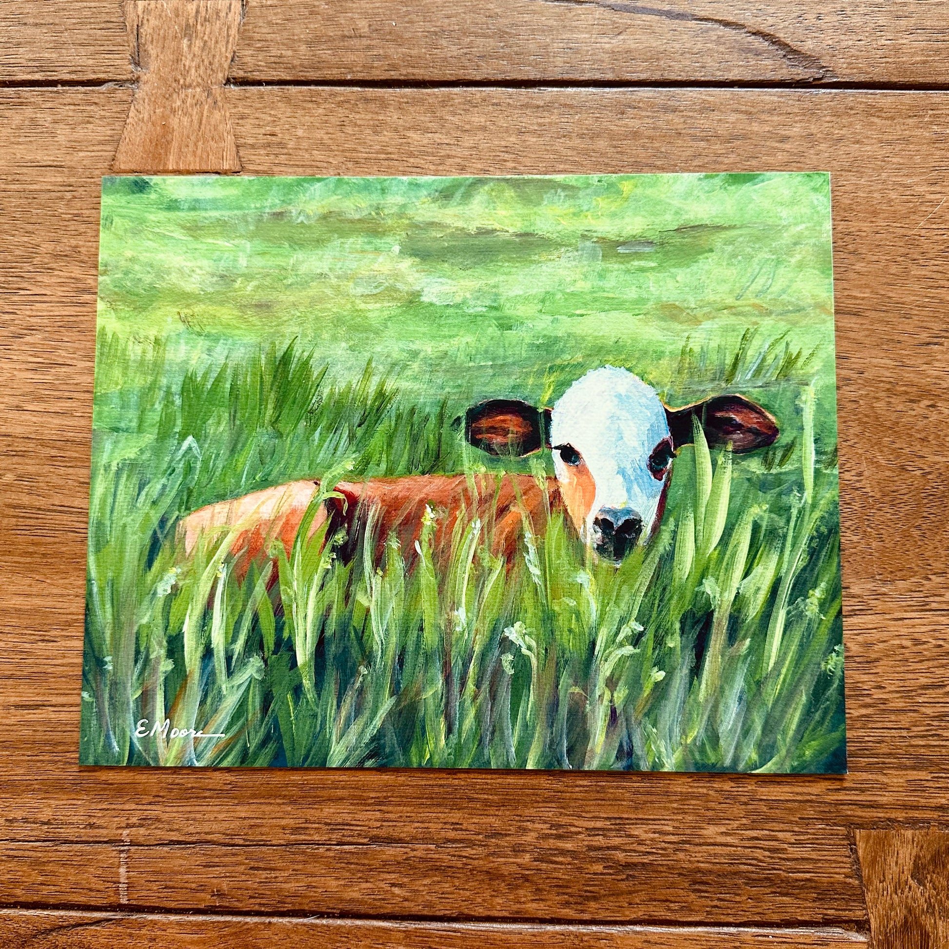 This fine art print of the original artwork “Resting Calf” portrays a newborn calf resting in a green meadow.