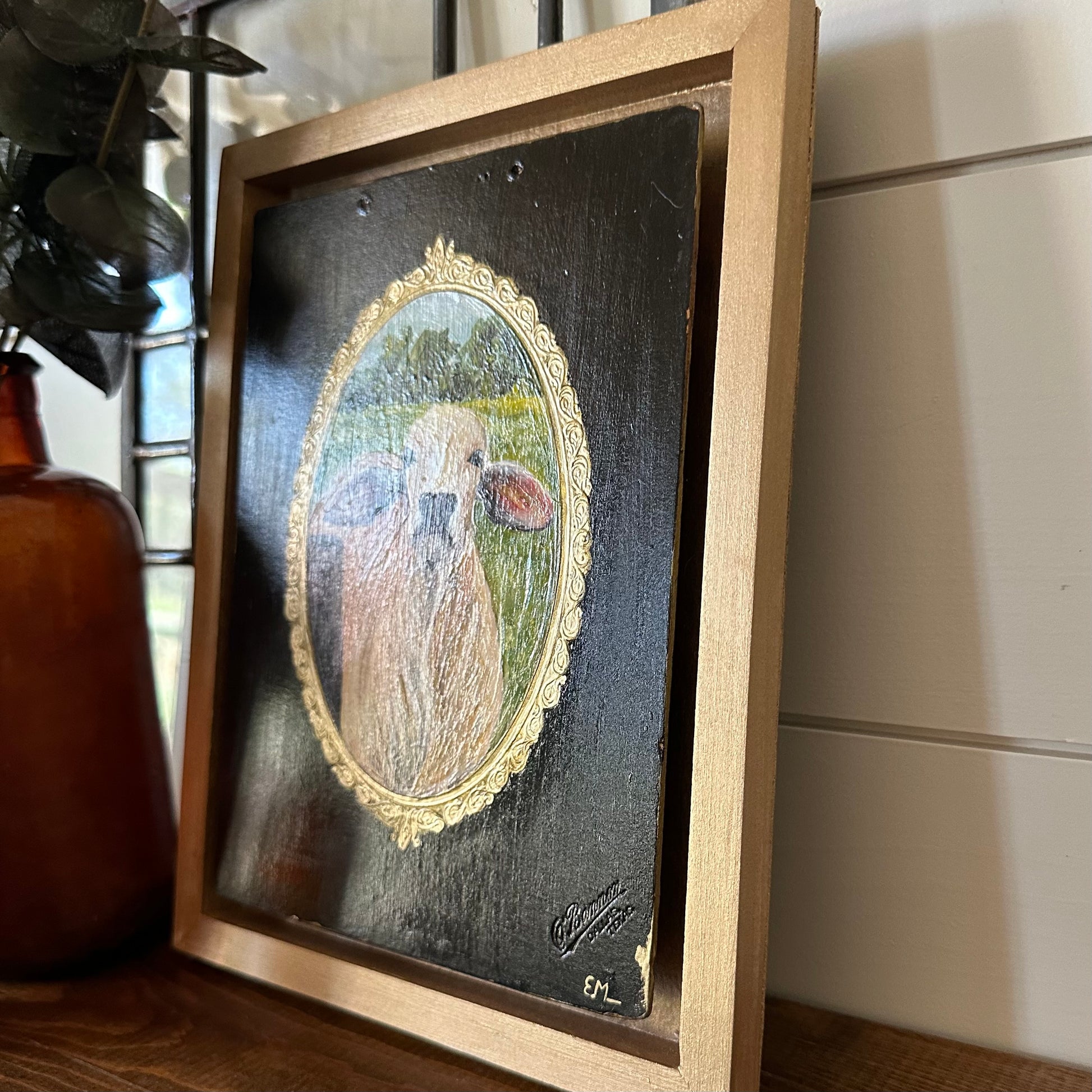 This Brahma portrait is skillfully painted on a vintage photo mat and framed in an 7.5 x 9.5 inch handmade cradled wood floating frame, highlighted with a gold finish. Ready to hang or perfect for a shelf display