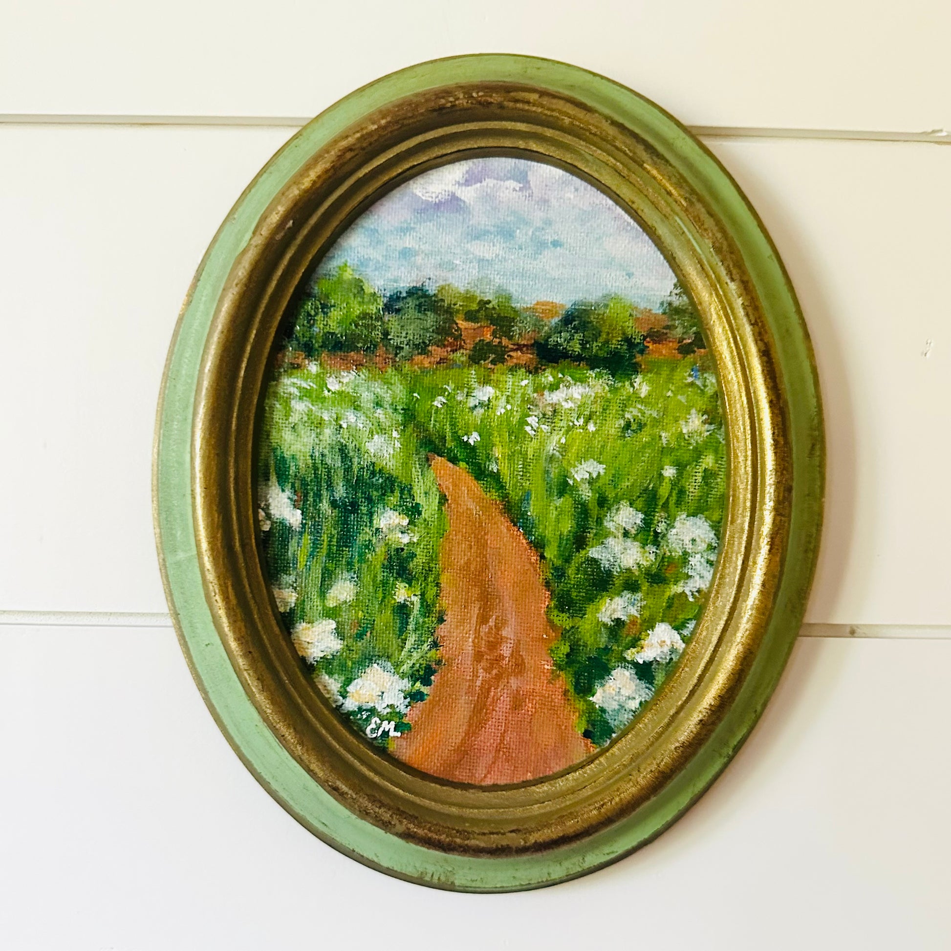 This fine art print of the original artwork “Field of White” portrays a beautiful scene of a pathway winding through a field of white wildflowers.