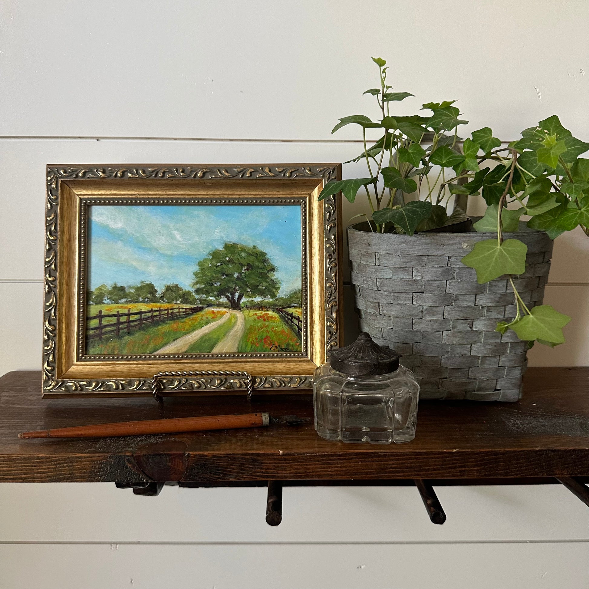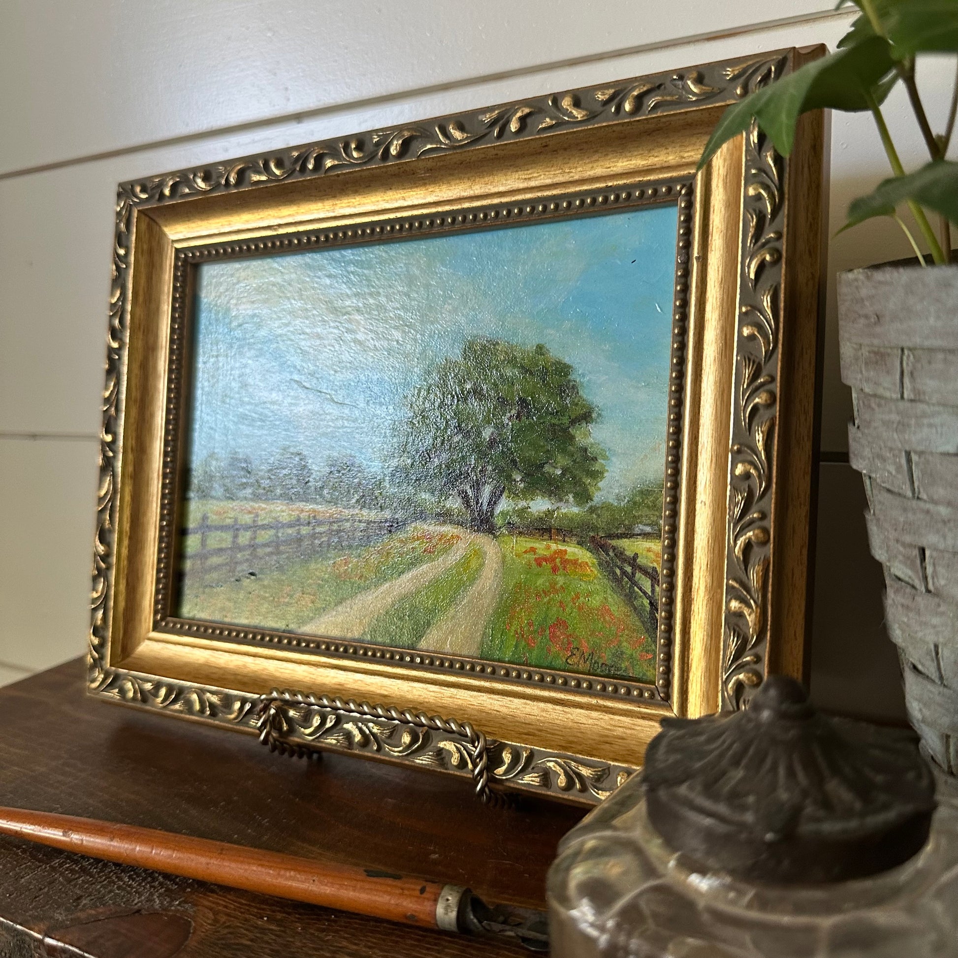 This acrylic painting captures a picturesque country scene during the summer. Perfect for shelf styling or ready to hang, this original artwork is painted on a wood panel and displayed in an antique, ornate gold wood frame measuring 9.25 x 7.25 inches.