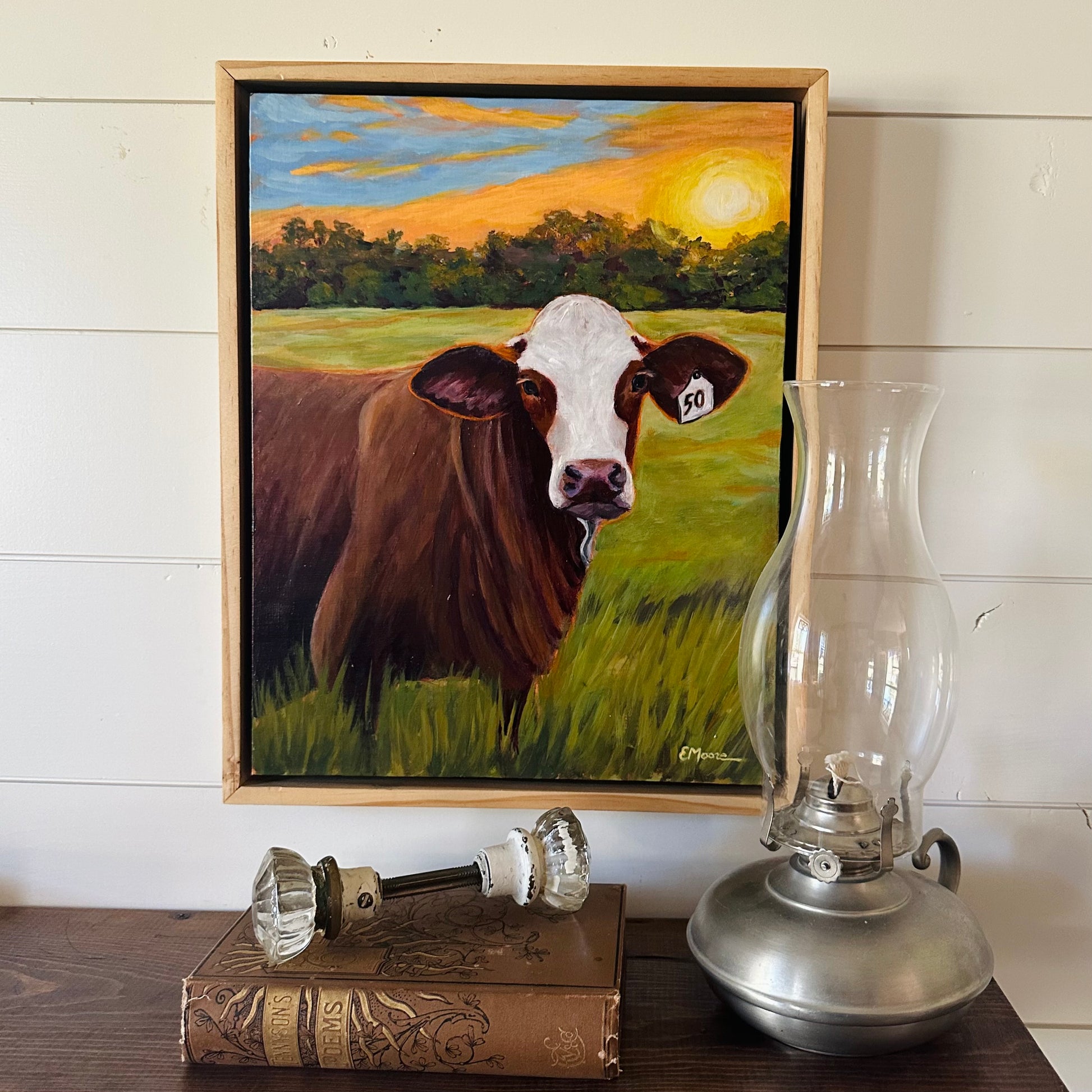This original artwork portrays a cow at sunset. The piece is artistically hand-painted on a 11 x 14-inch canvas panel and is mounted in a custom wood floater frame with overall dimensions of 11.75 x 15.25 inches.