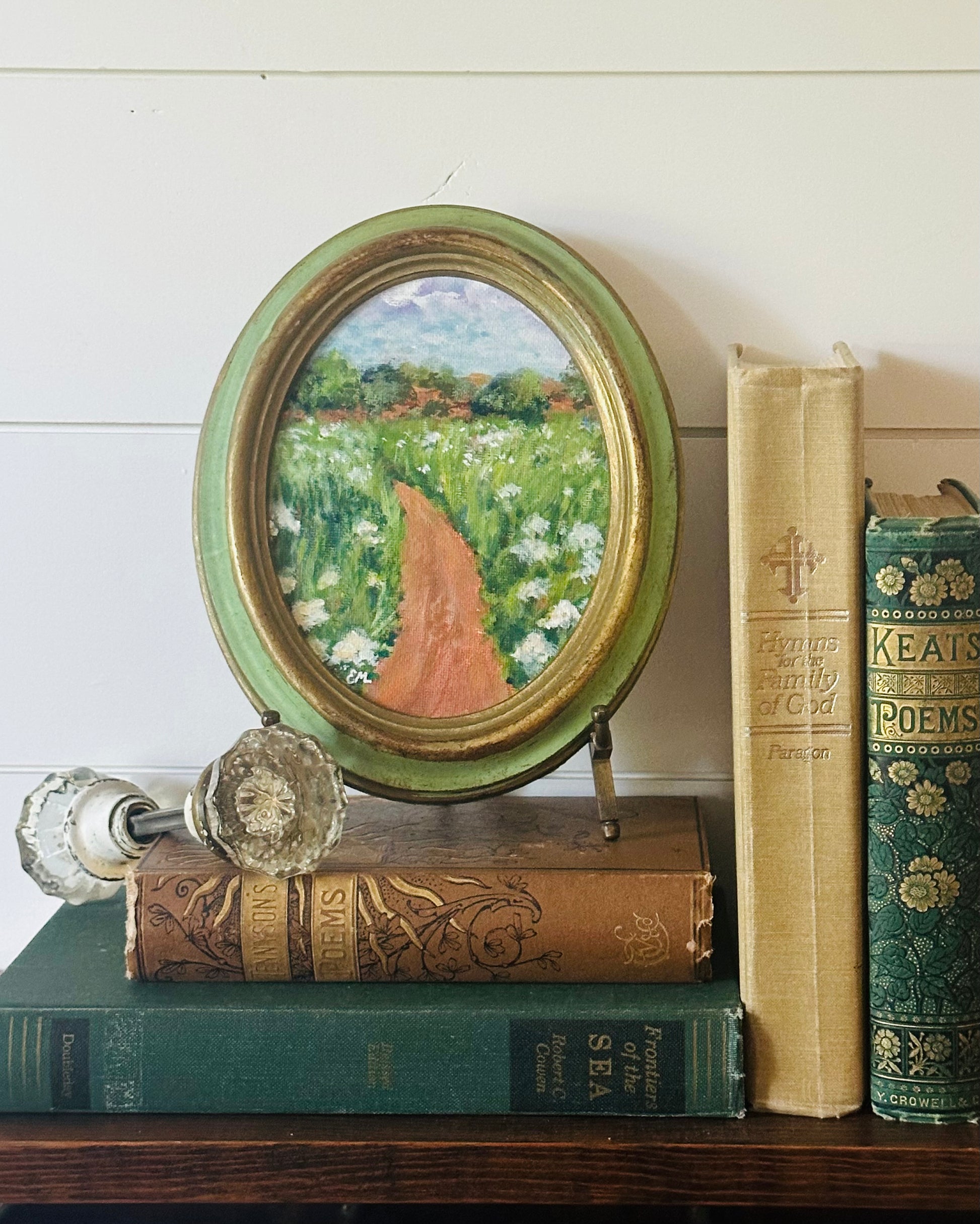 Beautiful original painting of a pathway leading through a field of white wildflowers. Framed in an oval antique Italian Florentine reproduction frame. Measures 8.25 x 6.5 inches overall including frame.