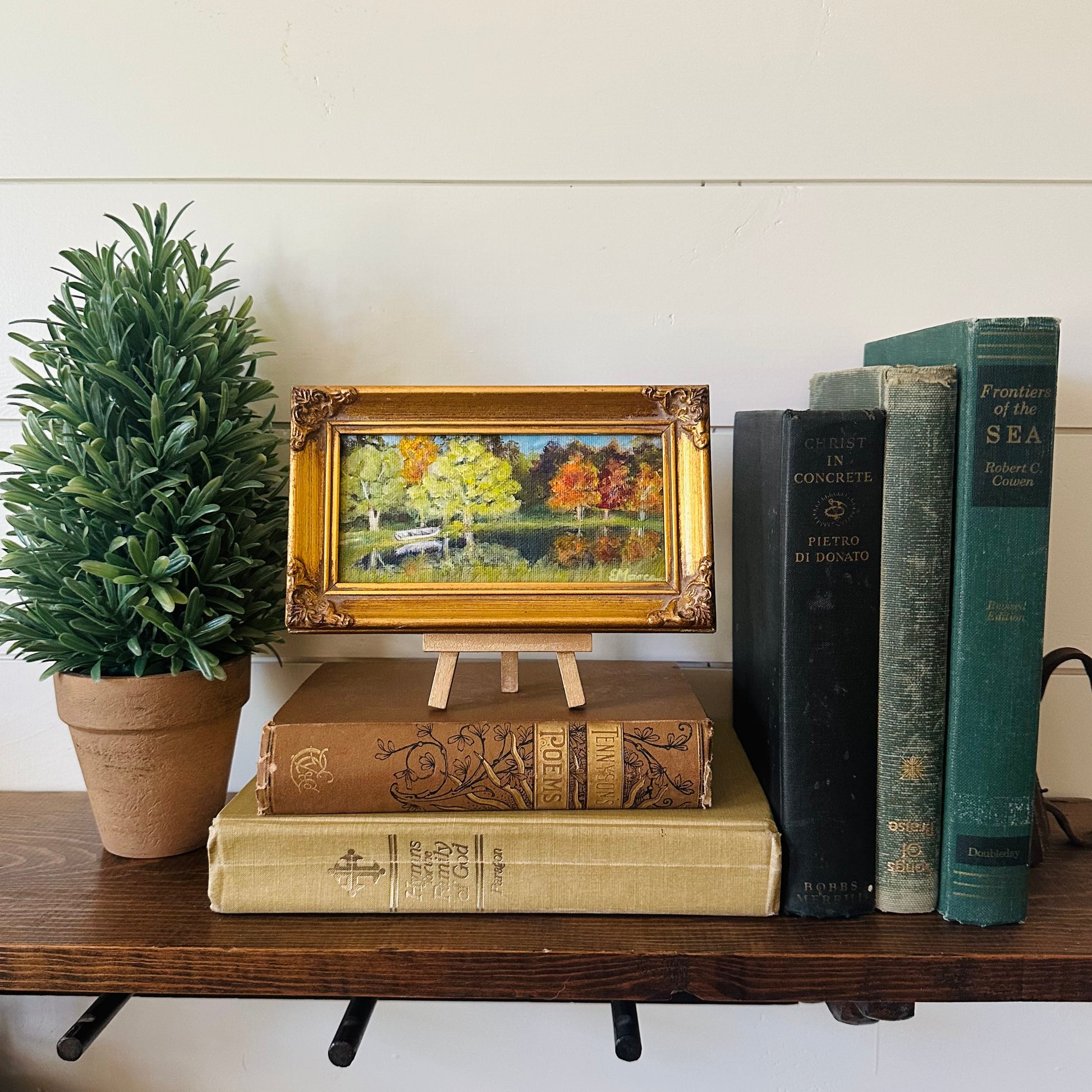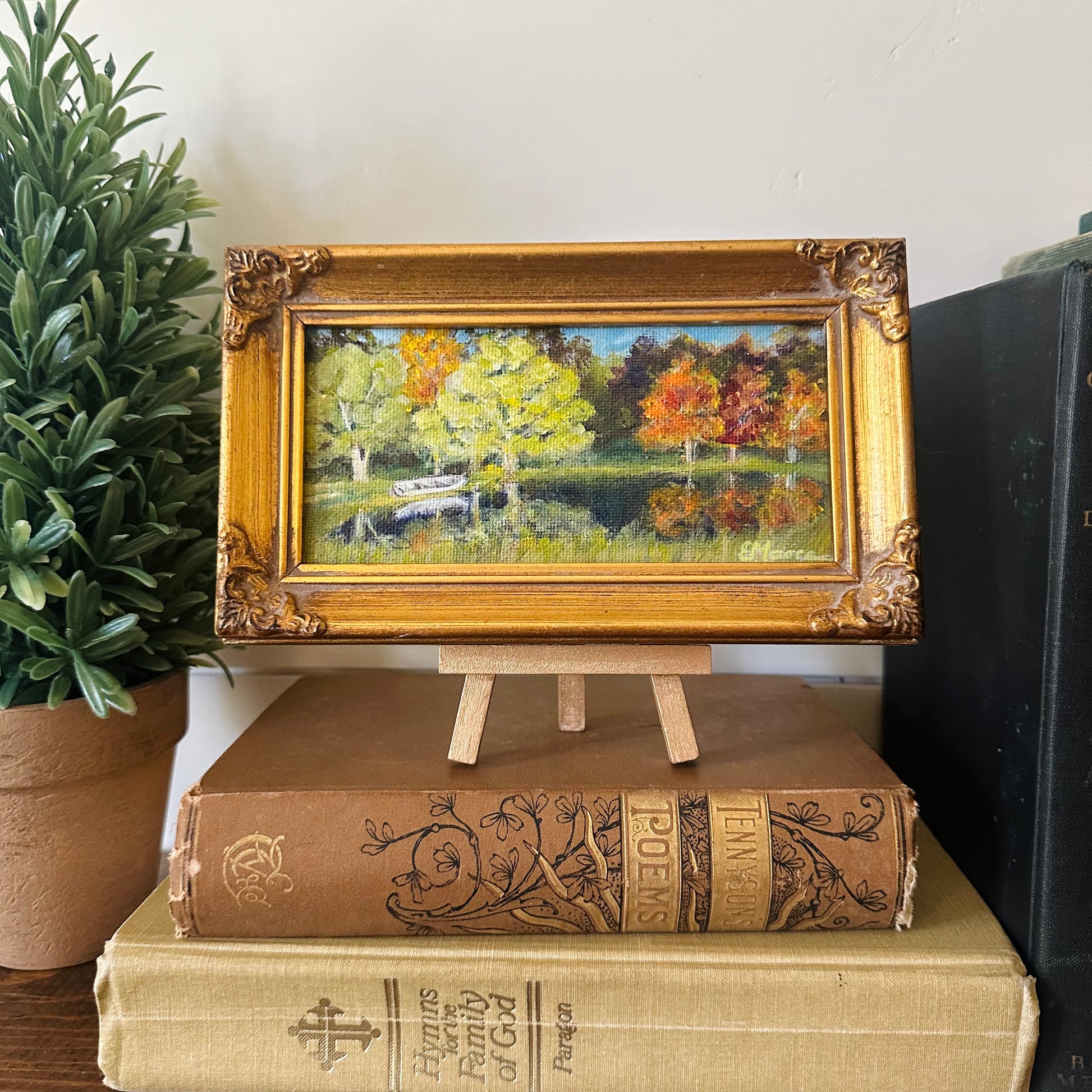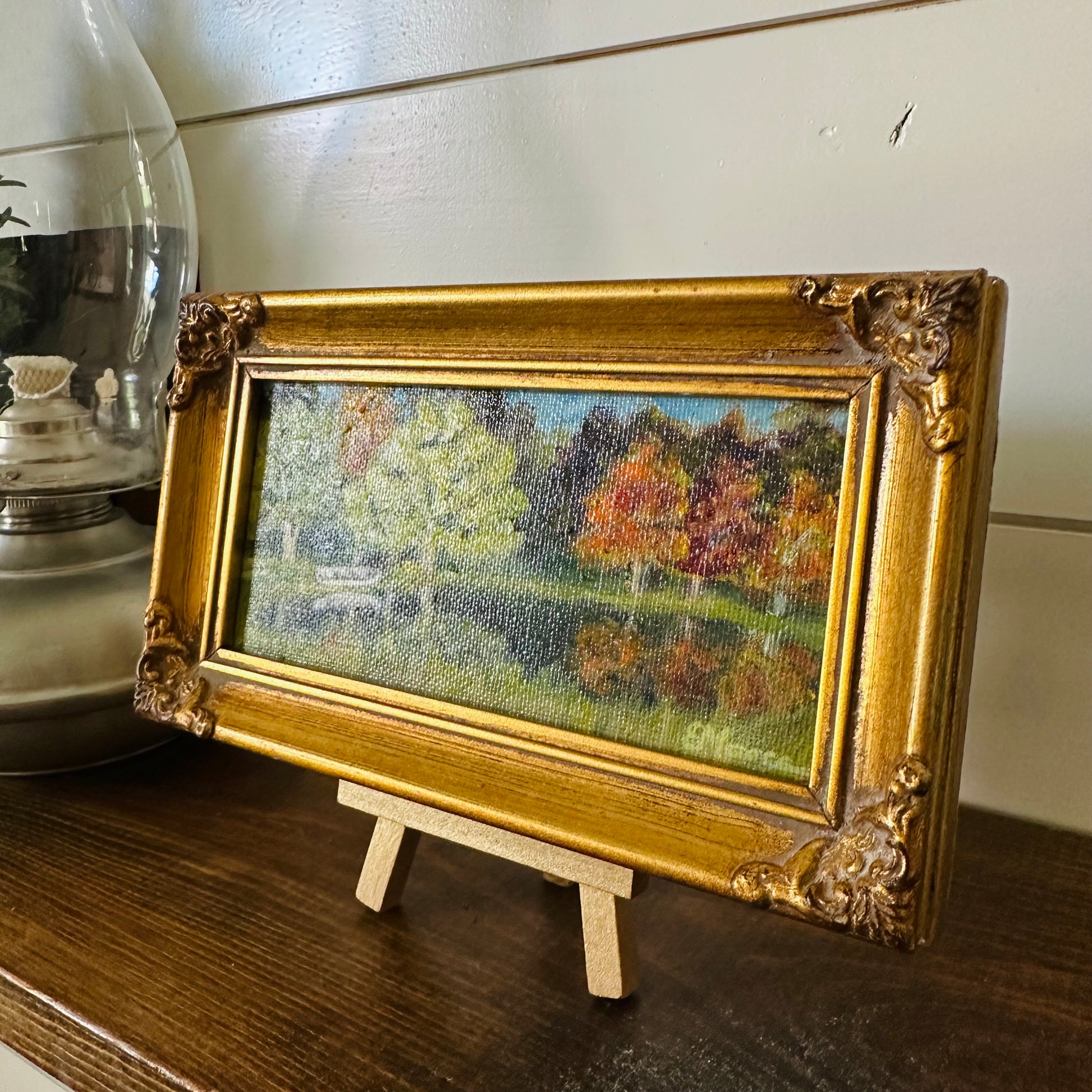 This petite painting, measuring 4 x 7 inches, beautifully captures the essence of Fall. Crafted with acrylic on canvas, this unique piece comes in a vintage gold painted wood frame adorned with intricate details. An accompanying gold easel makes for easy display on a shelf or tabletop.