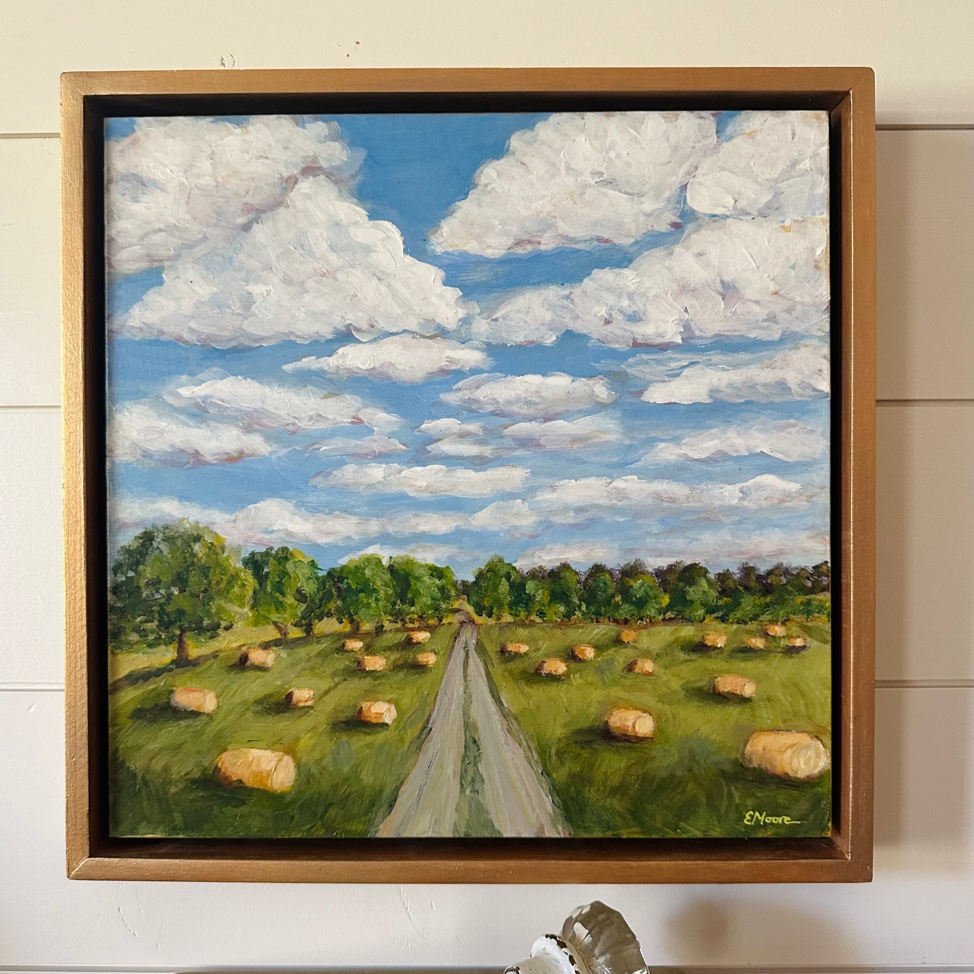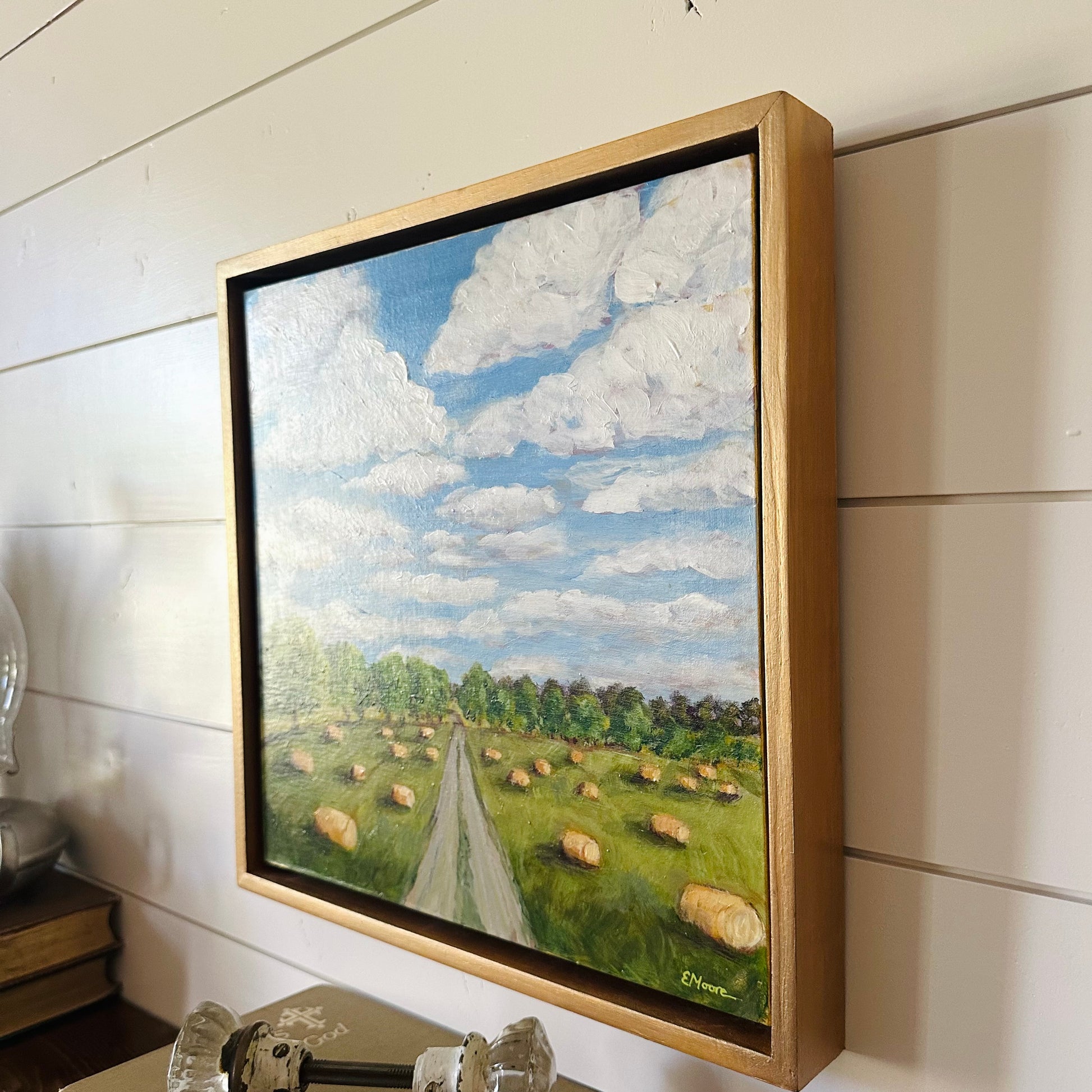 This original painting captures the beauty of a field with hay bales and is created on a 12-inch square canvas panel, elegantly framed in a custom gold painted wood floater frame with overall measurements of 13.25 inches square.