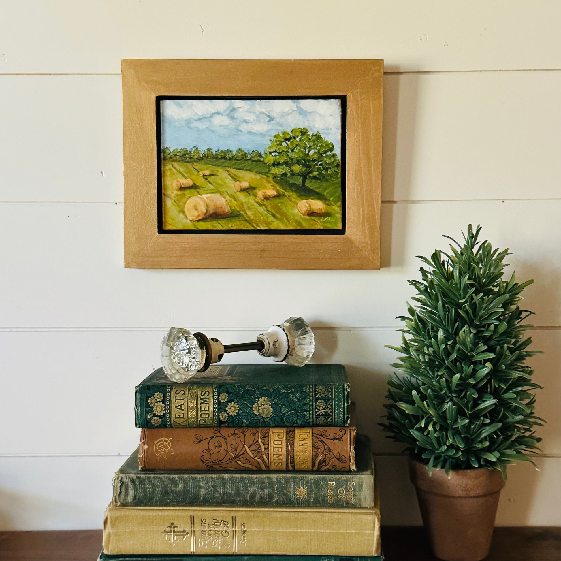 This acrylic painting captures a picturesque country scene with hay bales during the summer. This original artwork is painted on a 5 x 7 inch canvas panel and mounted in a cradled wood floating frame, highlighted with a gold finish. Ready to hang or perfect for a shelf display. (Framed dimensions approx. 8 x10 inches)