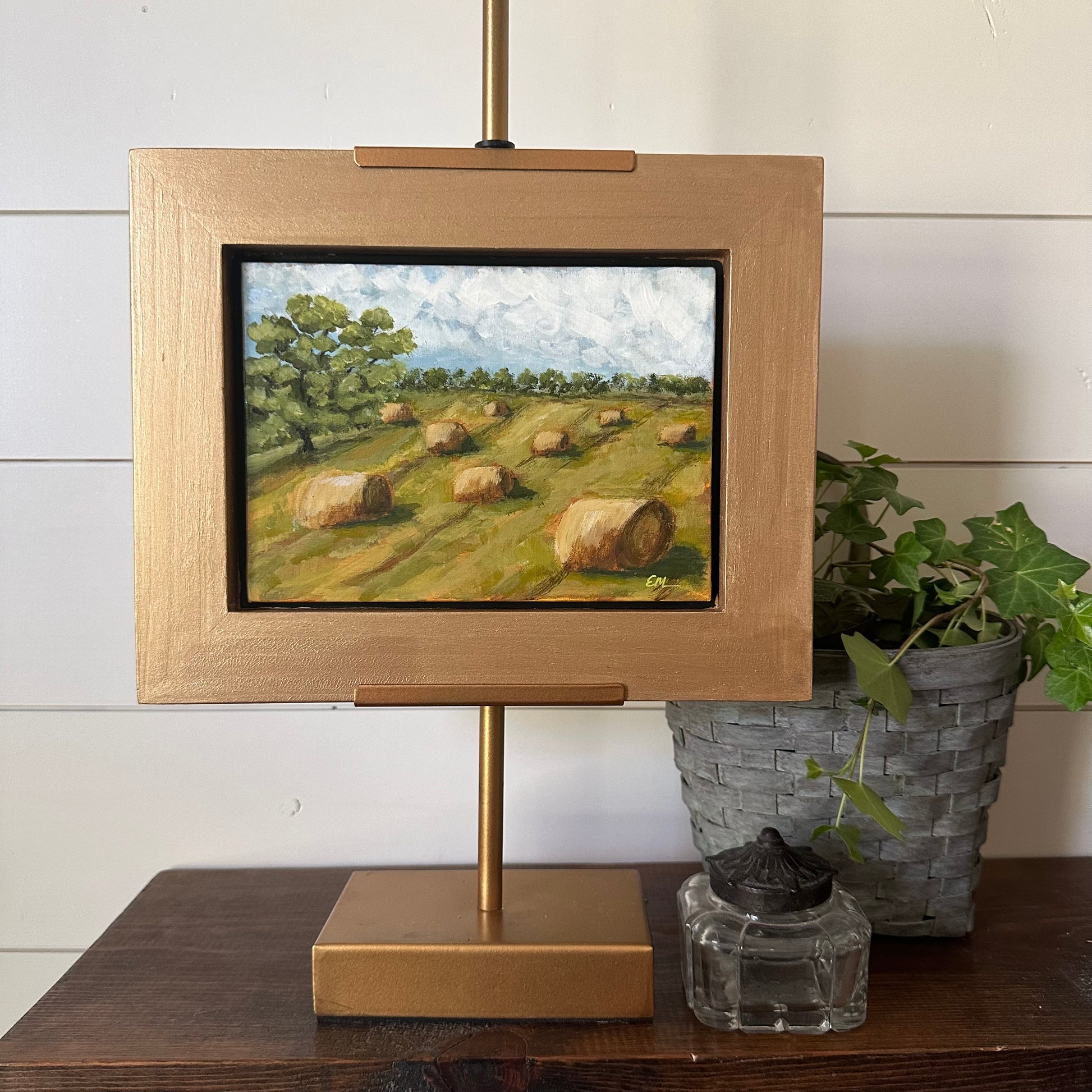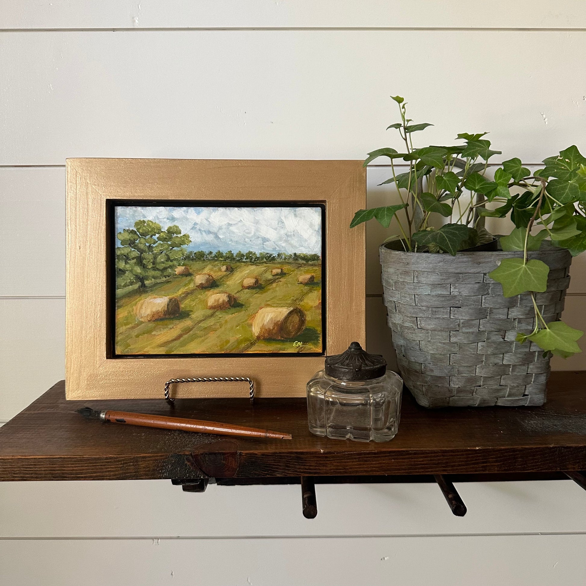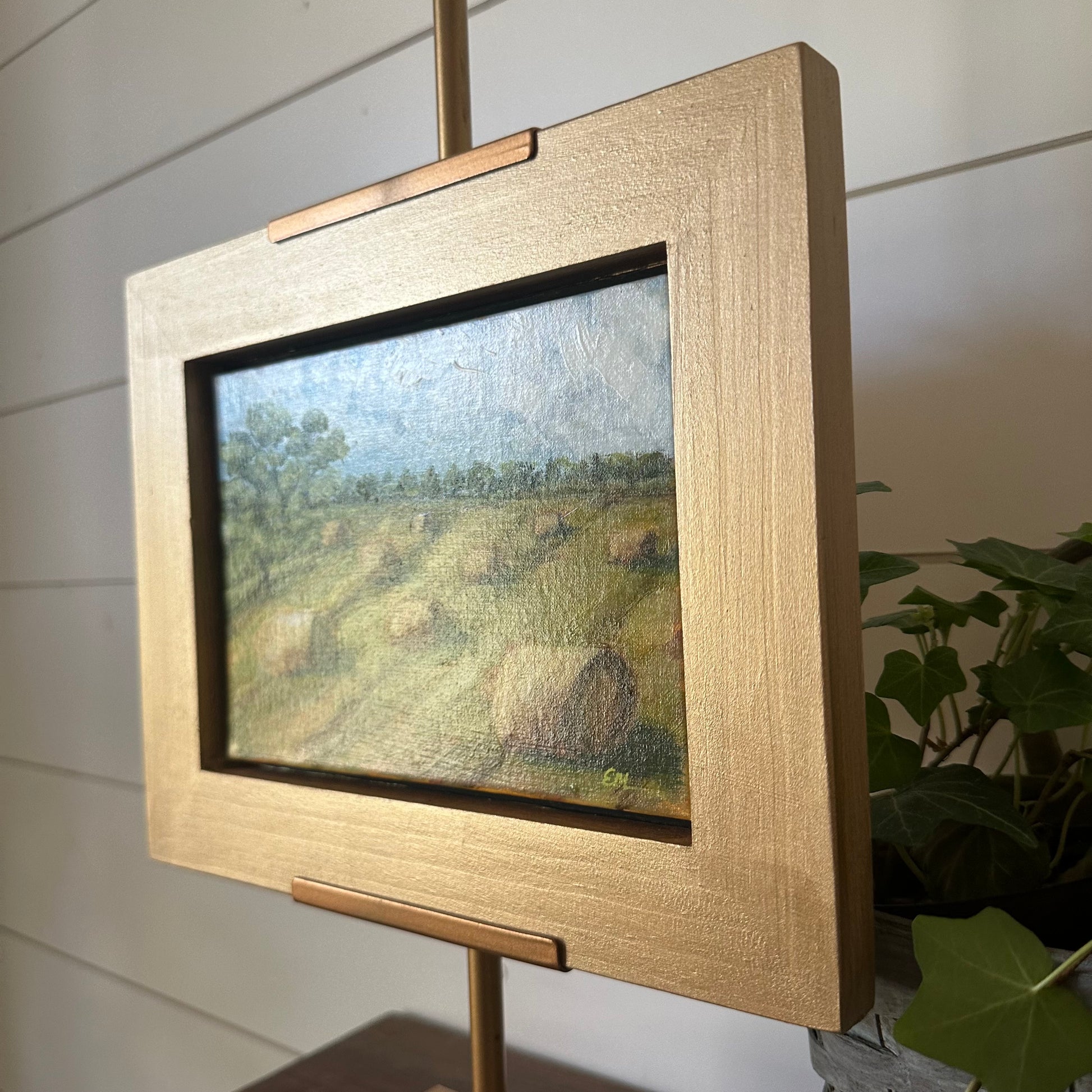 This original acrylic painting captures the beauty of summer hay bales. Painted on an 5 x 7 inch canvas panel and mounted to a cradled wood floating frame, highlighted with a gold finish. Ready to hang or perfect for a shelf display. (Framed dimensions approx 8x10 inches)